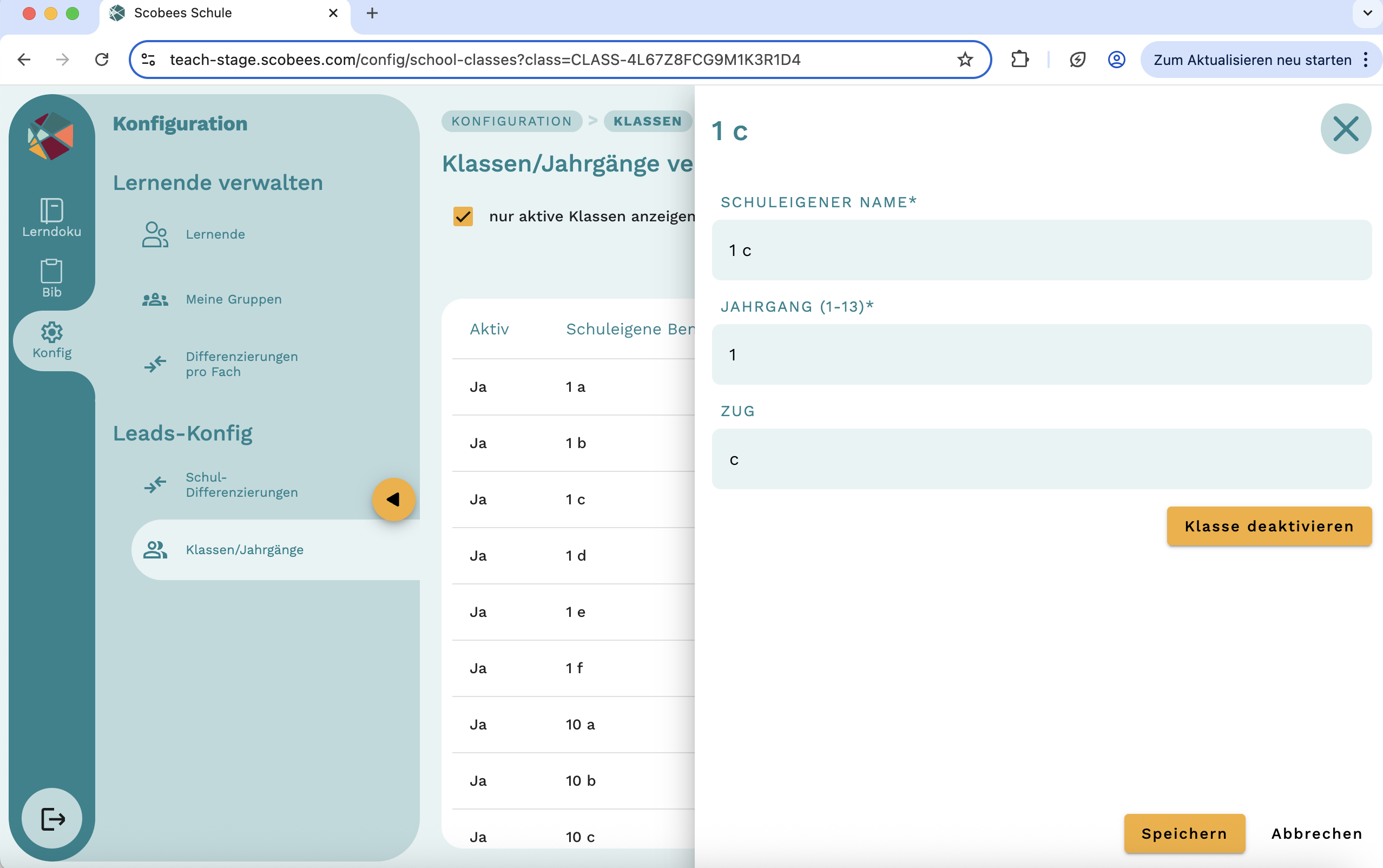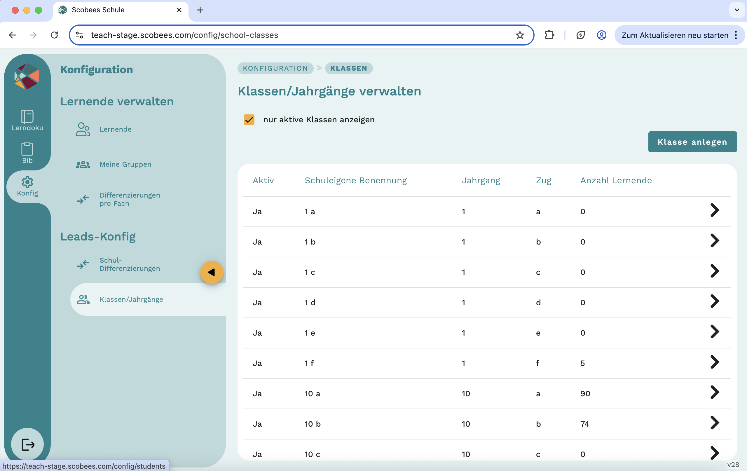Sie können jetzt beliebig viele Klassen erstellen, frei benennen oder nur die Klassen auf "aktiv" schalten die sich benötigen. Dies macht die Filterung nach Klassen in Scobees einfacher!