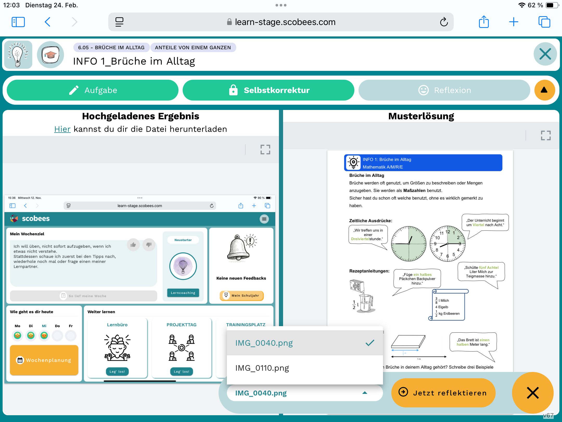 Bitte beachtet, dass bei Aufgaben mit Selbstkorrektur der Button "Ich habe alles korrigiert" geklickt werden muss, damit danach das 1. erste Lernergebnis und das 2. Lernergebnis - die Korrektur des Lernergebnisses - im TAB Selbstkorrektur abgerufen werden können über das Dropdown (IMG_0040.png und IMG_0110.png). Die Korrektur des Lernergebnisses kommt sonst NICHT in der Lerndoku an.